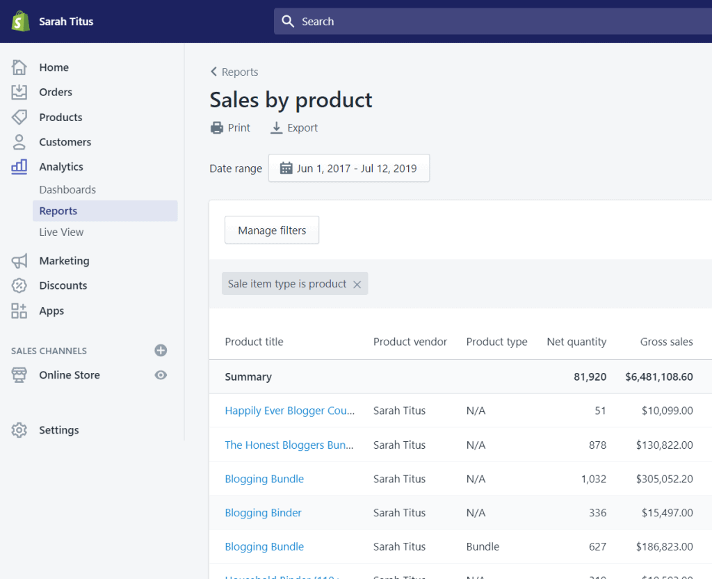 Then, when you start making $1k/month+, you’ll want to move to the $79/month Shopify plan because that includes better analytics. You can see how much sales you’re making for each product and that helps you determine what KIND of products to create MORE of.