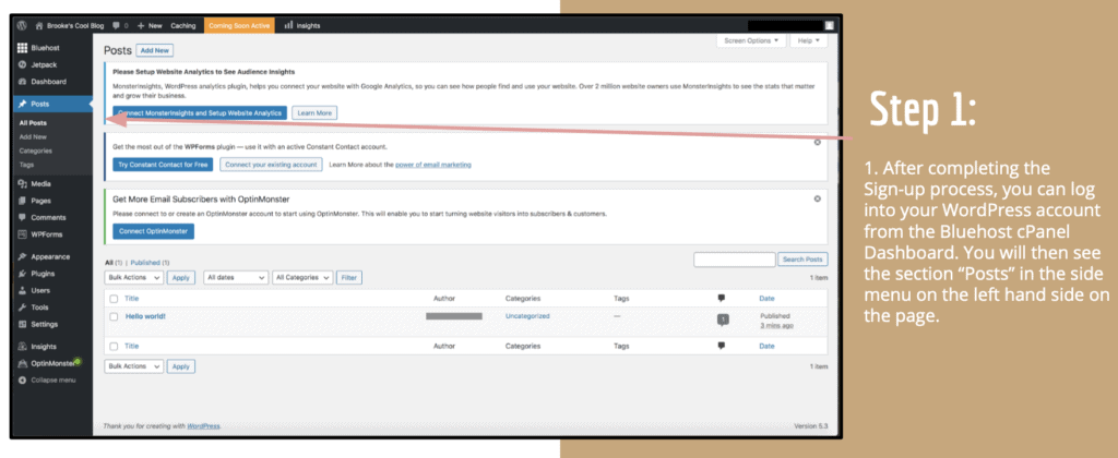 After completing the sign-up process, you can log into your WordPress account from the Bluehost cPanel Dashboard. You will then see the section “Posts” in the side menu on the left hand side on the page.